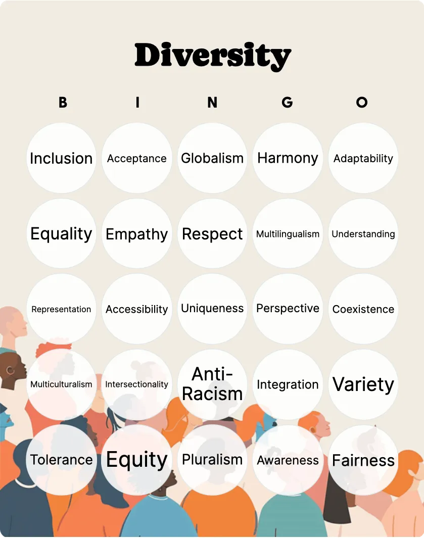 Diversity Bingo Template - Instead of purchasing mass-produced calendars that may include unwanted features or waste materials, users can opt for printable calendar templates tailored to their specific needs. The appeal of these custom designs lies not only in their functionality but in their ability to be both visually appealing and deeply personal. In addition to visual personalization, printable templates are increasingly being designed to be more adaptable to different time zones, languages, and cultural contexts. With their flexibility, customizability, and endless possibilities, it's no wonder that printable templates have become a staple in many homes and offices around the world. Platforms such as Etsy, Canva, and Creative Market enable creators to design and sell printables catering to niche audiences. So why not give one a try today, and see the difference that a little creativity and customization can make in your life? designed branding elements can be distributed to clients and partners as promotional items, reinforcing brand recognition and creating a practical resource for recipients. Printable calendar templates tailored for corporate use are typically designed for efficiency, with clean layouts that prioritize functionality while maintaining a professional appearance. Adding drawing elements to these templates enhances creativity and engagement during collaborative sessions. Printable digital calendars often come in formats such as PDF, which can be filled out electronically before printing. The ease of sharing designs online has also contributed to a thriving community of creators who exchange ideas, offer feedback, and support one another in honing their skills.