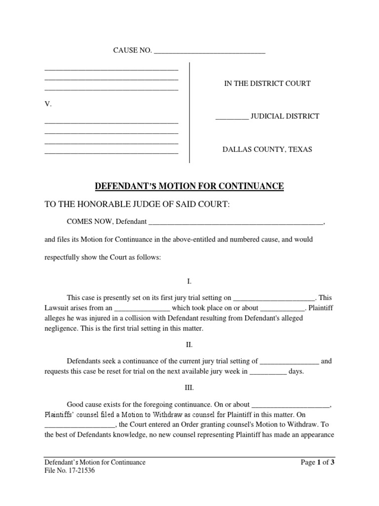 Motion For Continuance Template Texas - These specialized calendars not only help users stay organized but also promote habits that contribute to physical and emotional well-being. Despite the many benefits of printable calendar templates, some people may be hesitant to give them a try due to concerns about quality or durability. Another trend that is redefining the world of printables and templates is the rise of subscription-based services. Printable calendars are also becoming increasingly interactive, thanks to advancements in design tools and software. Similarly, science teachers can use templates to create diagrams that students label and color, reinforcing their understanding of complex concepts. Creative professionals and artists have embraced printable templates as a canvas for their own designs. For example, a family might work together to design a monthly calendar featuring drawings of each member’s favorite activities, turning scheduling into a collaborative and enjoyable experience. Additionally, themed templates designed specifically for vacations or travel adventures can make the planning process more engaging, allowing travelers to visualize their journey in a fun and organized way. Websites offering free and premium printable templates abound, catering to a global audience with diverse needs and preferences. Wedding planners, for example, rely on customizable templates to design printable timelines, checklists, and seating charts that align with the event’s theme and schedule.